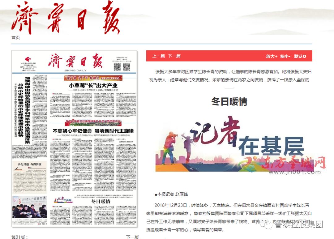 1月4日,《济宁日报》头版“记者在基层”专栏题为《冬日暖情》的一篇文章,专题报道了陕西鲁泰海则庙项目部职工张振太多年资助困难学生陈长青的感人事迹,给寒冷的冬日增添了浓浓暖意,在离家两千里外工作的广大干部职工中引起强烈反响。